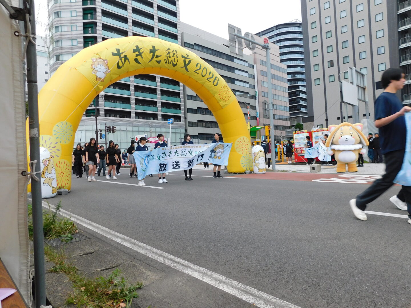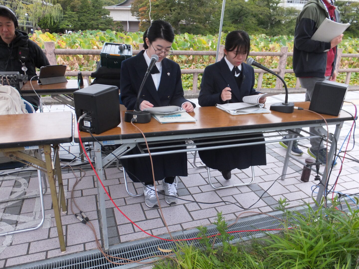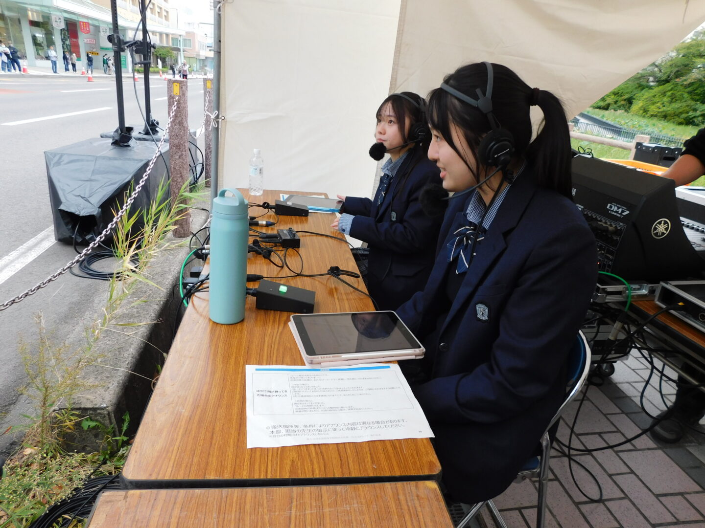 パレード 出発地点のアトリオン向かい側と中間地点の中土橋付近に放送席が設置され、パレードの進行やパレードに参加した団体の紹介を行いました。また、放送部門の生徒実行委員もパレードに参加しました。