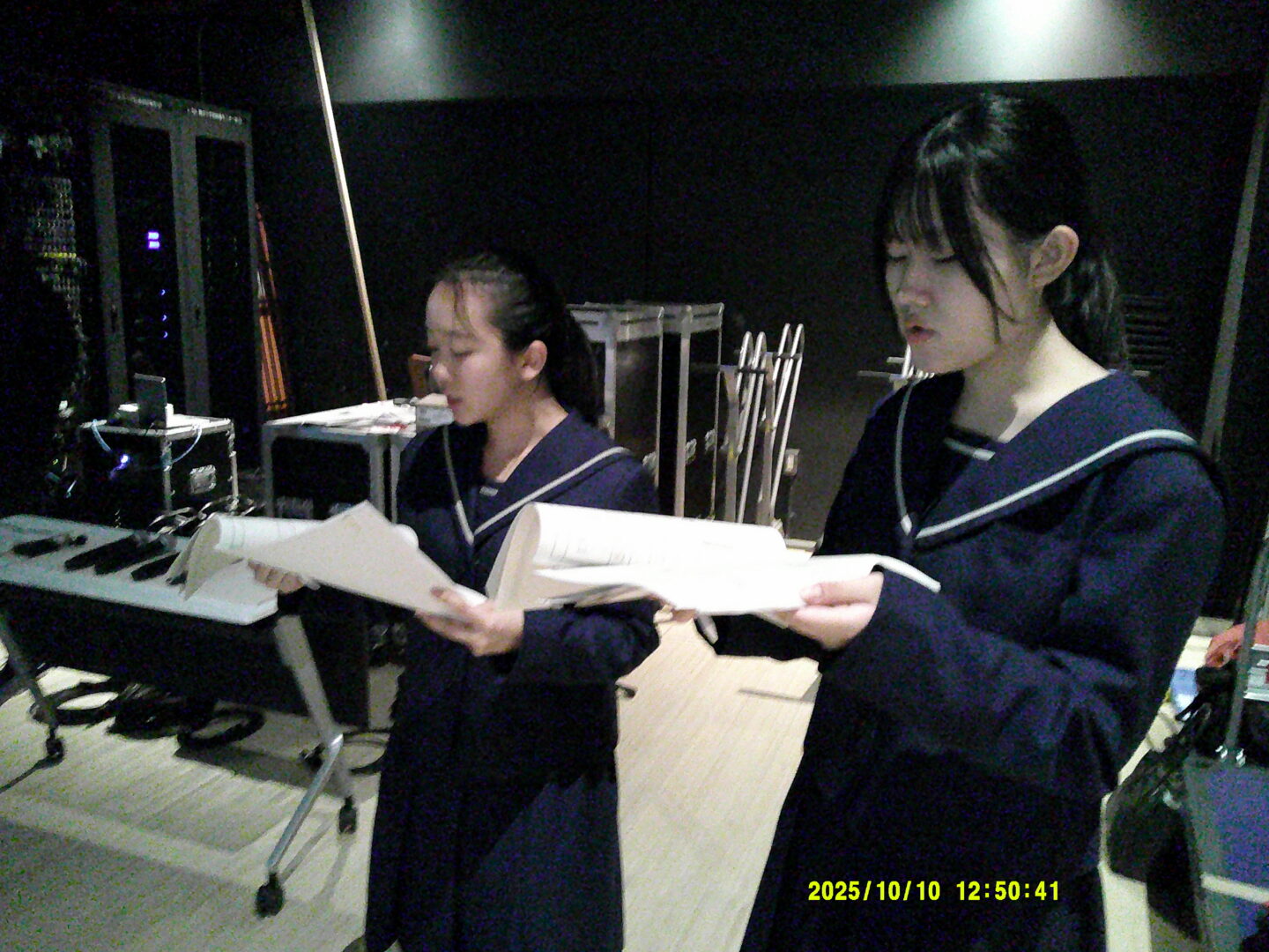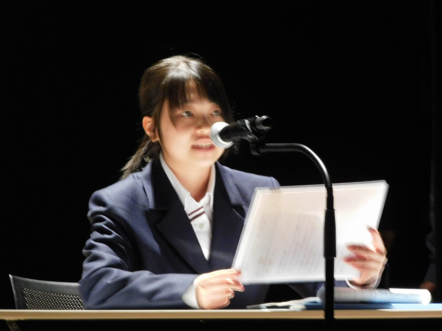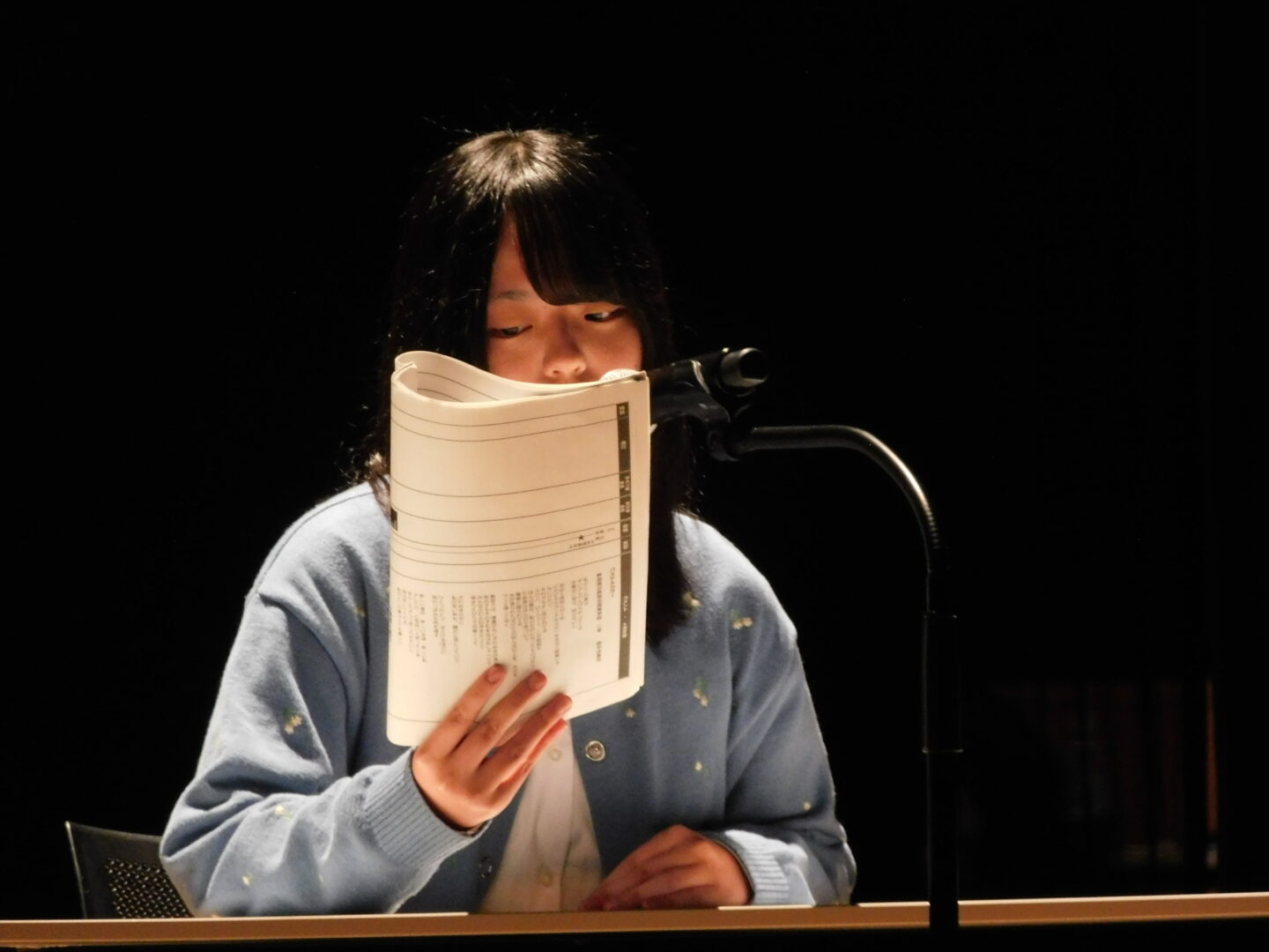 開催地発表(前日リハの様子) 文芸部門の生徒が創作した詩を朗読しました。