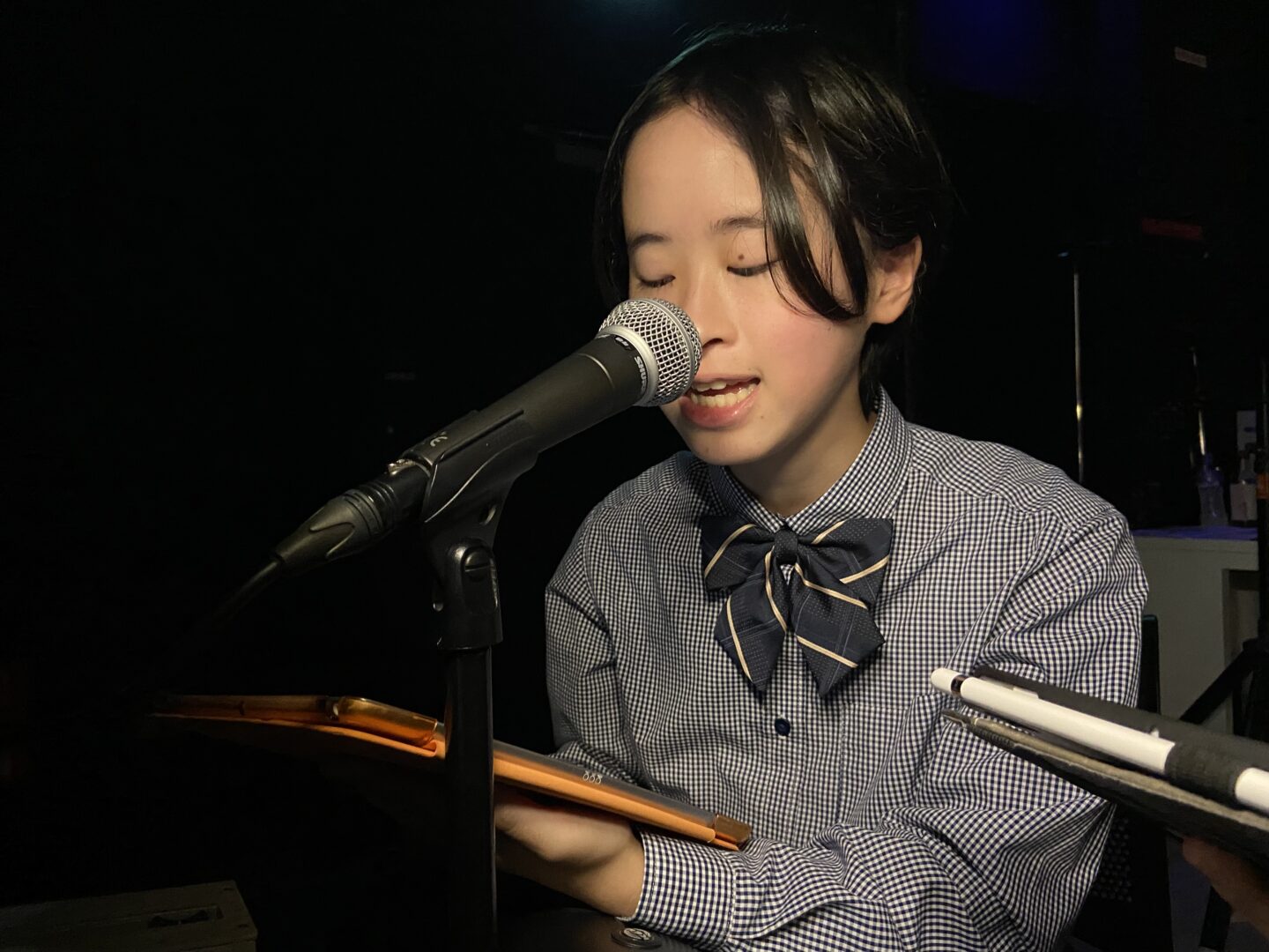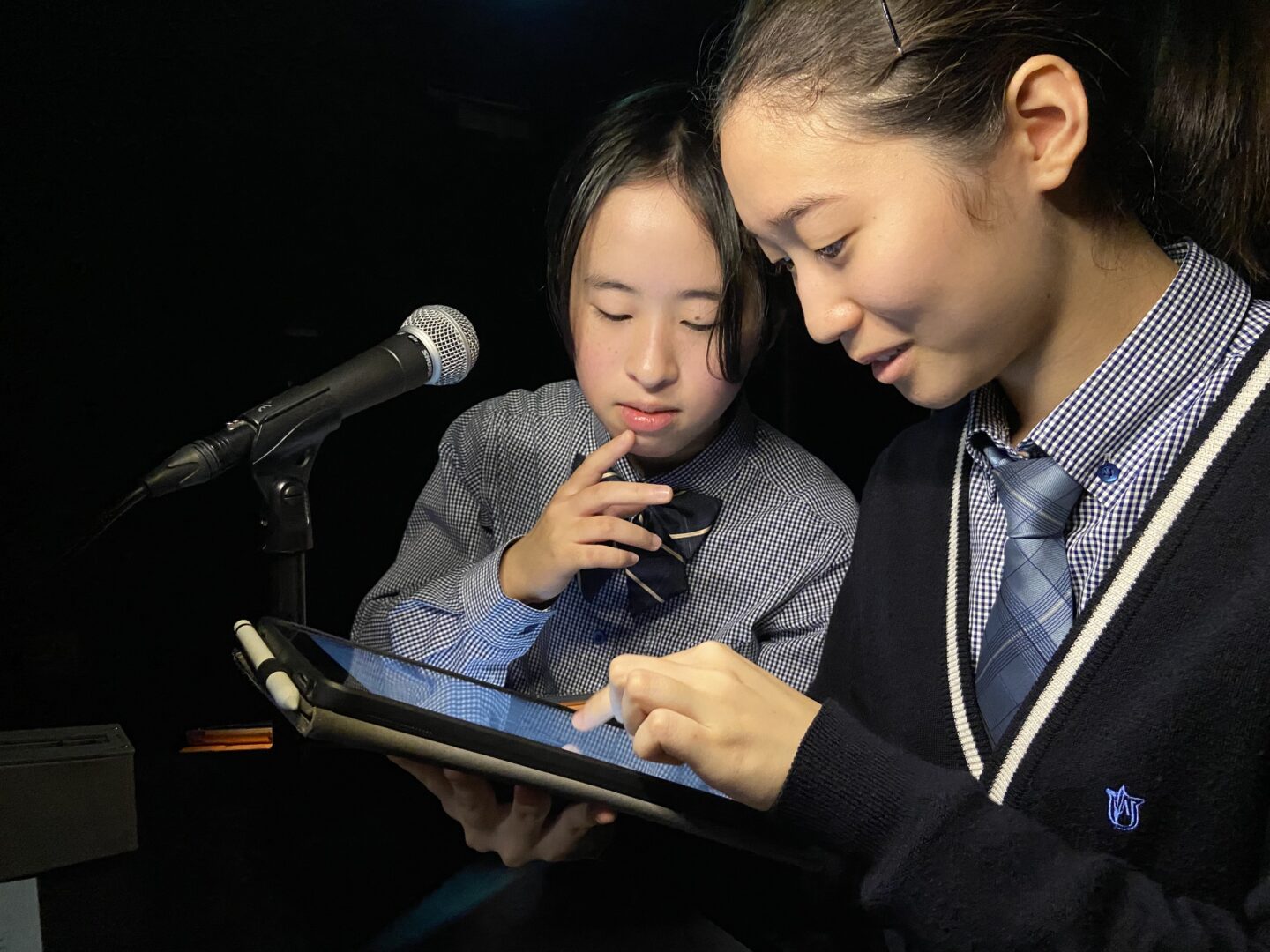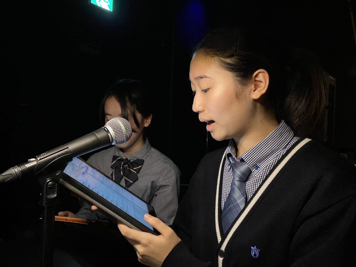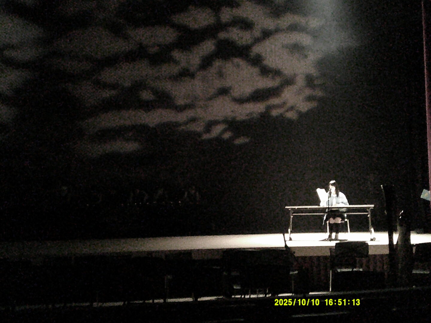 開催地発表(前日リハの様子) 文芸部門の生徒が創作した詩を朗読しました。