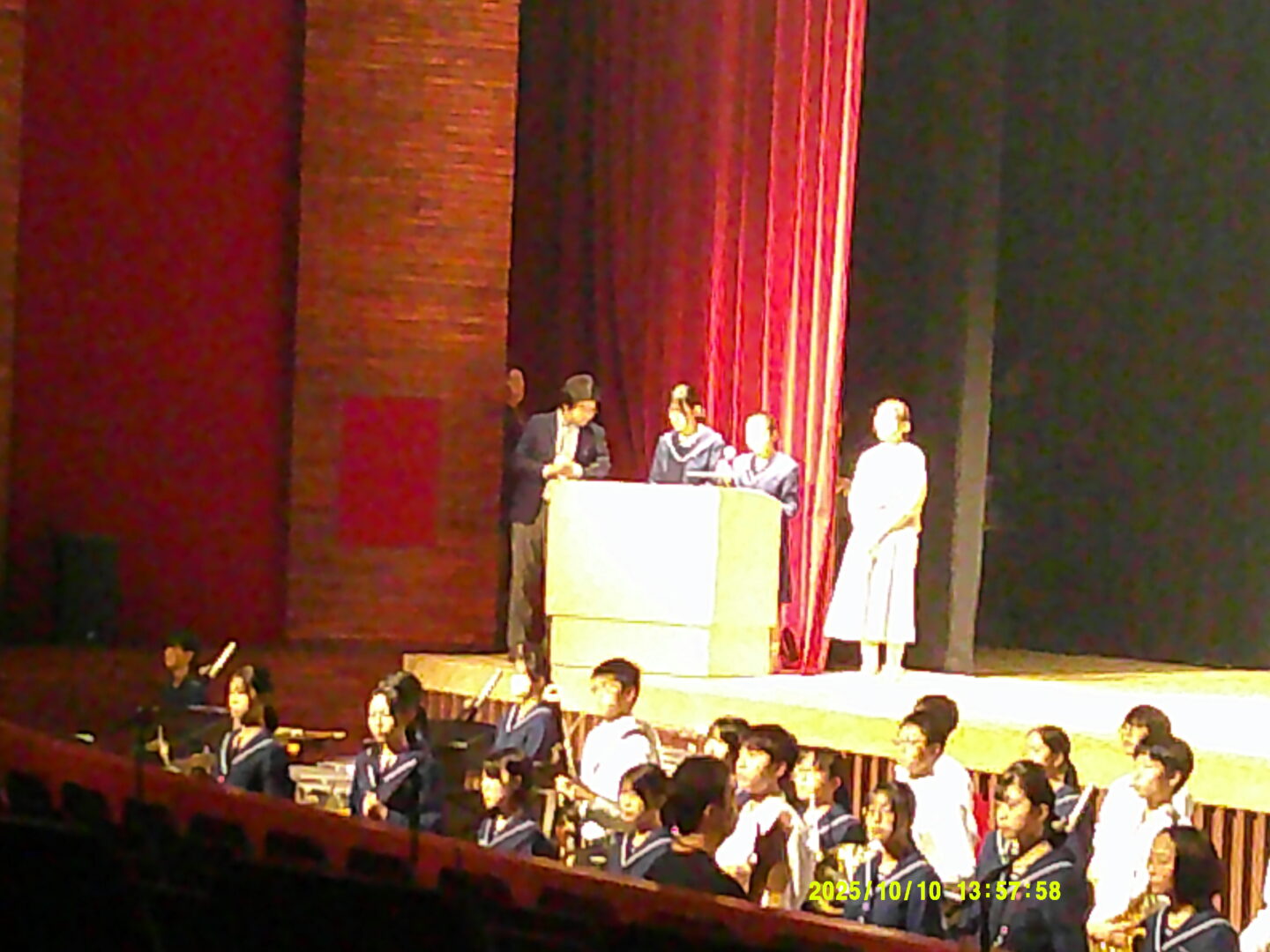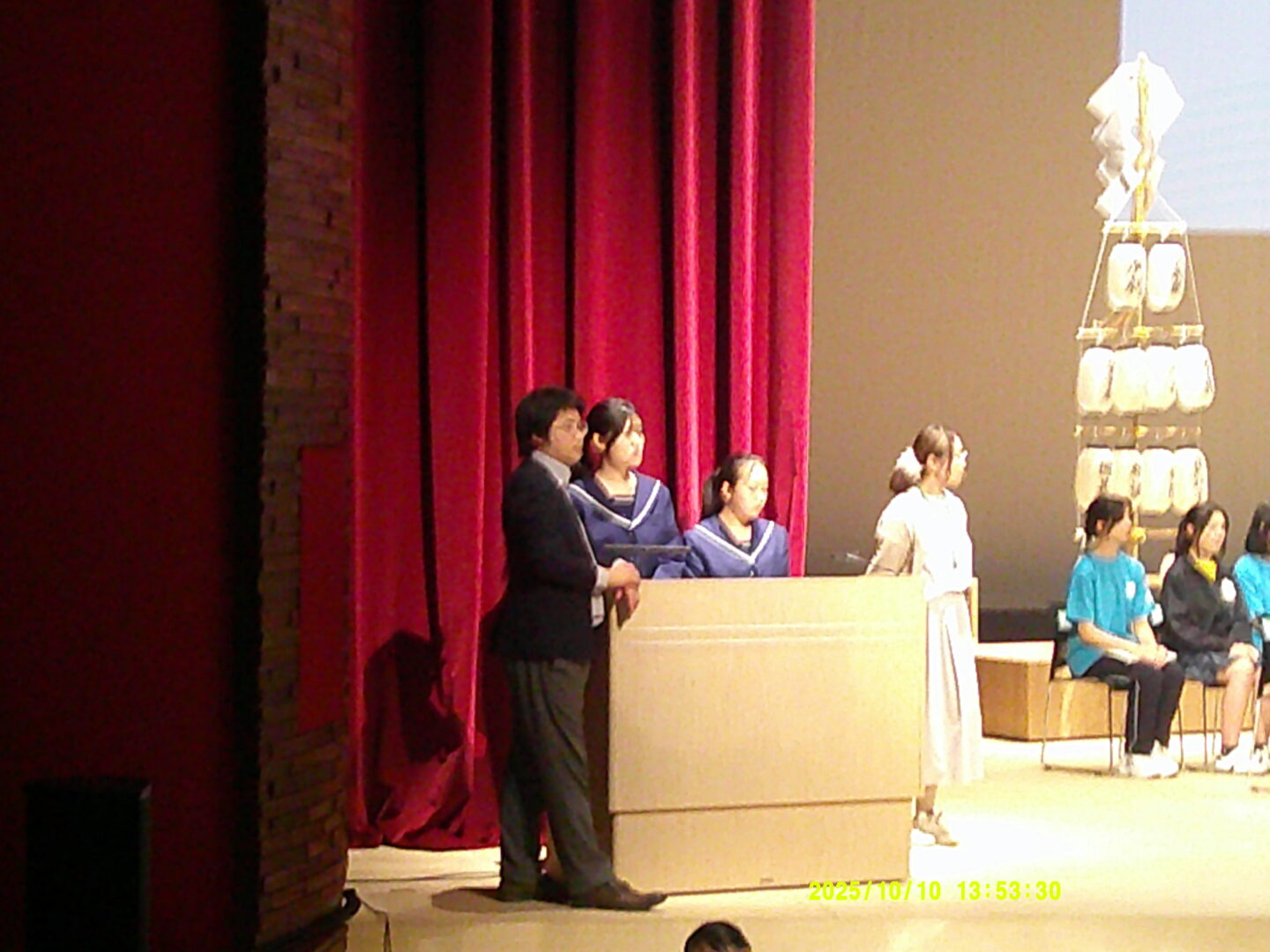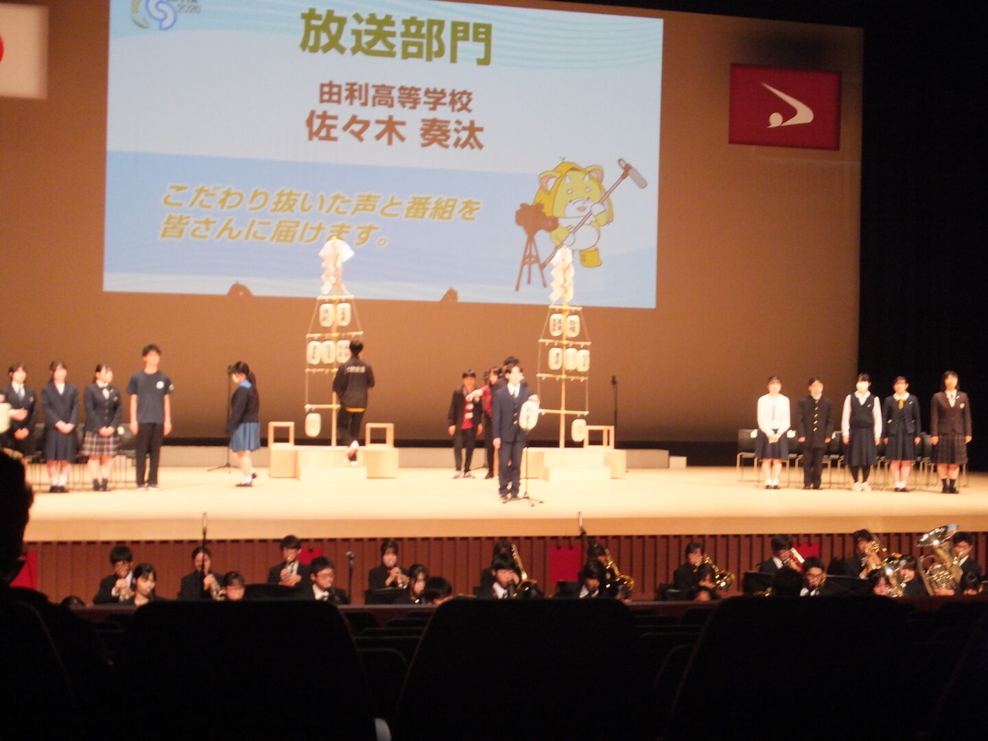 2025年10月11日(土)に秋田芸術劇場ミルハスにおいてプレ大会総合開会式が行われ、その後に広小路においてパレードが行われました。放送部会では総合開会式の式典部門司会・影アナ・開催地発表中の朗読・パレードの進行を担当し、総合開会式の部門紹介とパレードに部門生徒実行委員が参加しました。